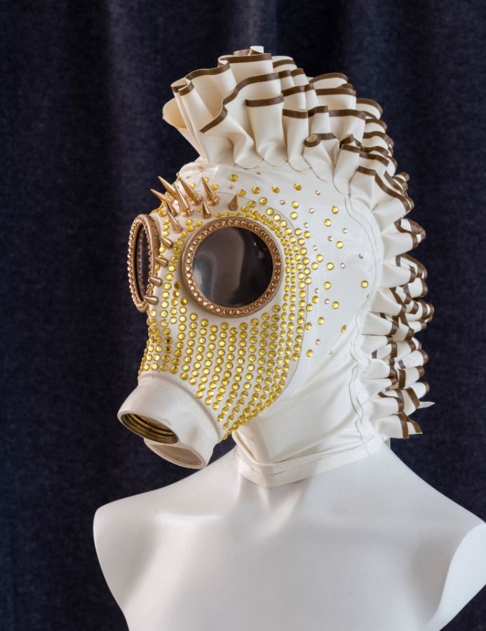 Rubbermasking specializes in customizing and embellishing gas masks. Whether with rhinestones, studs, horns, or a latex ruffle… the possibilities are endless. We strive to bring crazy ideas and individual wishes to life, making them wearable. Our range is complemented by stylish accessories such as boleros, hats, bags, and jewelry. Let our creations inspire and captivate you.